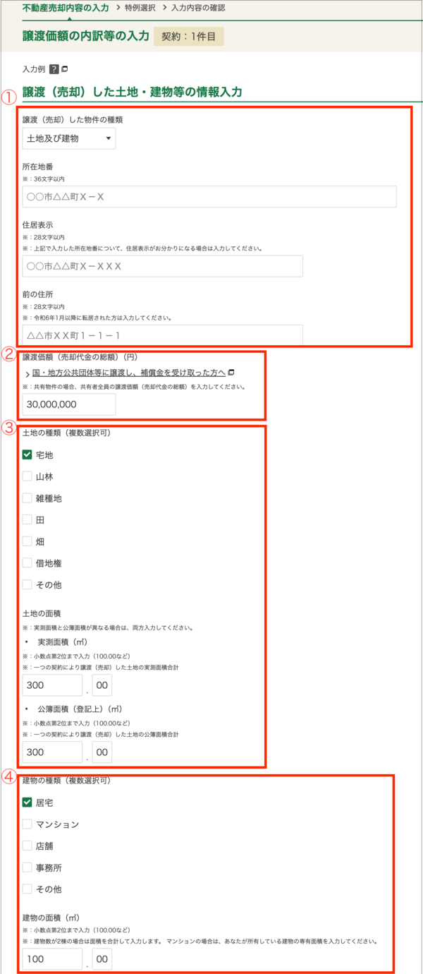 一つの契約ごとに入力しますので、一つの契約で譲渡(売却)する土地が複数ある場合には、「1ー1、1-2」のように並べて入力してください。書ききれない場合は、「・・・ほか〇筆」と記載してください。