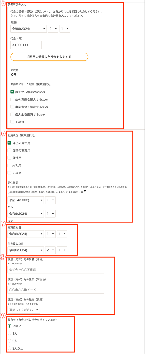 ② 売却代金の総額をそのまま記載してください。共有の場合も、共有者全員の総額を入力してください。