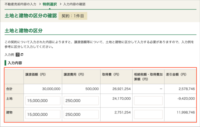 なお、区分された「譲渡価額」が契約書等に記載されていない場合は、土地価額の相場等を確認して計算するか、建物価額を元に計算するなどして入力してください。