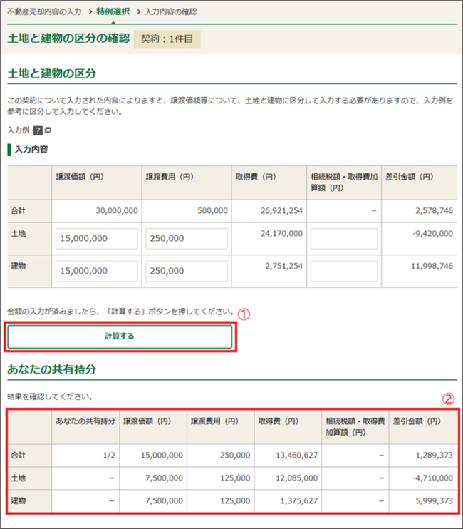 ① 「共有者がいない場合」と同様に土地と建物の区分の入力を行い「計算する」をクリックしてください。