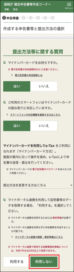 マイナポータル連携を利用しない場合は、「作成する申告書等と提出方法の選択」画面で以下のとおり「利用しない」を選択して進んでください。