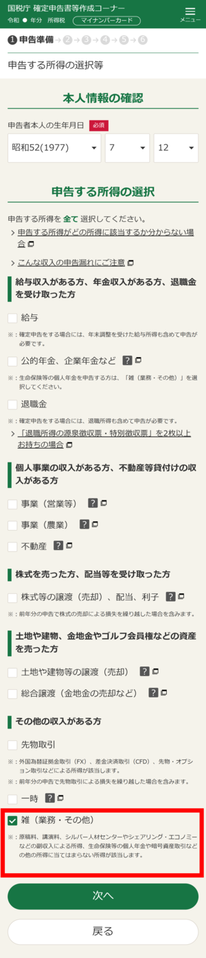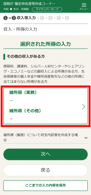 「申告する所得の選択等」画面で「雑(業務・その他)」を選択し、