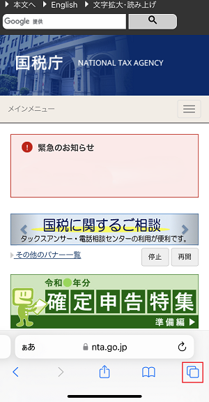 マイナンバーカードを読み取った後、確定申告書等作成コーナーの画面に遷移せず、別のタブで開いていたページが表示されることがあります。(画面例:別のタブで開いていた国税庁ホームページが表示された場合)