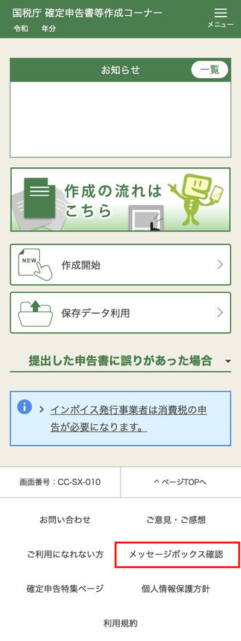 作成コーナートップ画面右下の「メッセージボックス確認」を押してください。