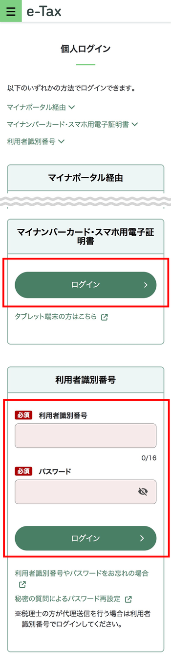 e-Taxのログイン画面が表示されますので、「マイナンバーカード・スマホ用電子証明書」の「ログイン」を押してください。