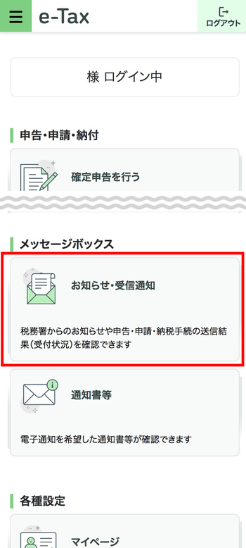 メニュー一覧の「お知らせ・受信通知」を押してください。