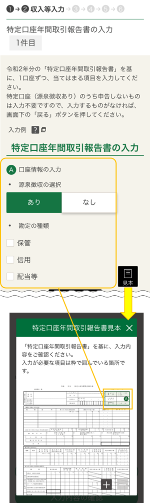 特定口座年間取引報告書の入力については、ほとんどの入力項目について、画面下の「見本」アイコンを押すと表示される年間取引報告書の見本画像のアルファベットと画面上の入力項目が対応しておりますので、そちらをご参考に入力してください。