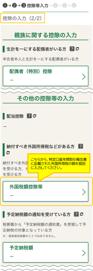 ただし、令和2年分については年間取引報告書に記載された「外国所得税の額」(株、配当)の入力欄がこの画面にありませんので、「控除の入力(2/2)」画面にある「外国税額控除等」から別途入力を行ってください。