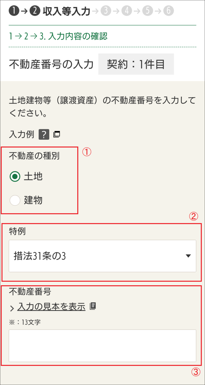 ① 不動産番号の入力を行う不動産の種別を選択して下さい。