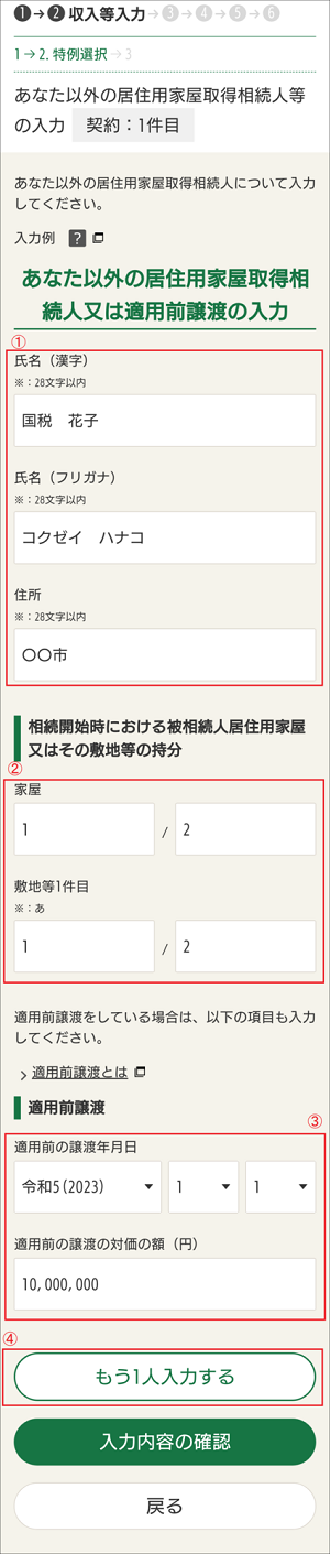 (注)あなた(申告される方)が適用前譲渡をしていた場合は、あなた(申告される方)以外の居住用家屋取得相続人を全て入力したあと、④の「もう1人入力する」をクリックし、③のみを入力して先に進んでください。