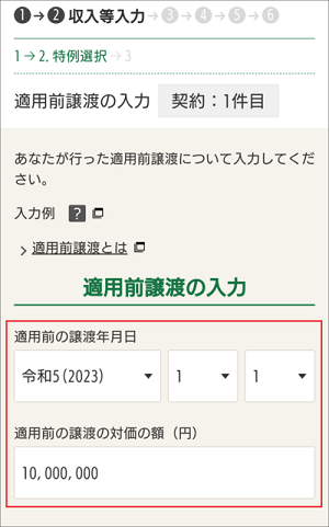 赤枠内に適用前譲渡を行った年月日及び適用前譲渡の対価の額(売却価額)を入力します。