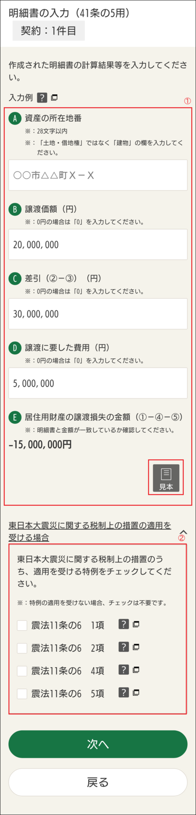① A~Dについては、見本を参考に作成された明細書の該当箇所を入力して下さい。また、Eについては自動計算されますので、作成した明細書の該当箇所と金額が一致しているか確認して下さい。② 東日本大震災に関する税制上の措置のうち、適用を受ける特例があればチェックして下さい。なお、特例の適用を受けない場合はチェックは不要です。