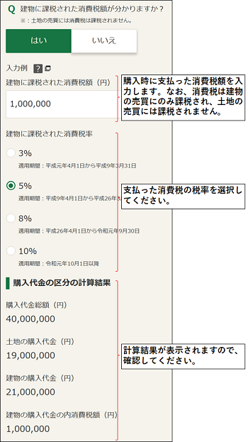 支払った消費税額から購入金額を土地と建物に区分します。
