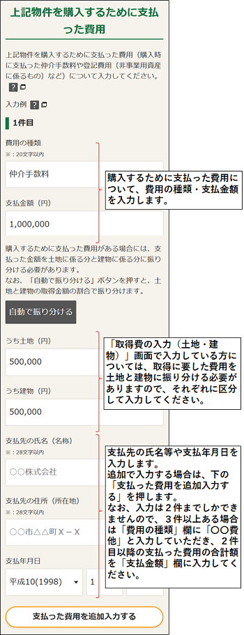 土地建物等を購入するために支払った費用(購入時に支払った仲介手数料や登記費用(非事業用資産に係るもの)など)について入力します。