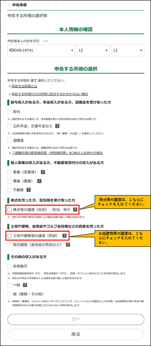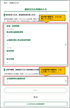 土地建物等の譲渡や株式等の譲渡の入力は、まず「戻る」ボタンを押し、「申告する所得の選択等」画面まで戻り、当画面の「株式等の譲渡所得」又は「土地建物等の譲渡所得等」欄のチェックボックスにチェックを入れ、「次へ」ボタンを押します。その後、「収入・所得の入力」画面に進みますので、当画面の「金融・証券税制」又は「土地建物等の譲渡所得」を押して入力してください。