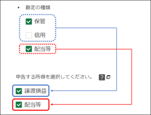 なお、「譲渡損益」を申告する場合は、「勘定の種類」の「保管」又は「信用」(若しくはその両方)にチェックを入れる必要があります。特定口座年間取引報告書に基づきチェックを入れてください。