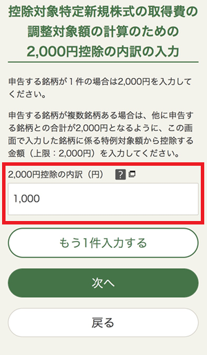 このため、各銘柄の取得費の調整対象額を計算する上で、各銘柄の合計が2,000円になるように、各銘柄について2,000円控除の内訳を入力してください。