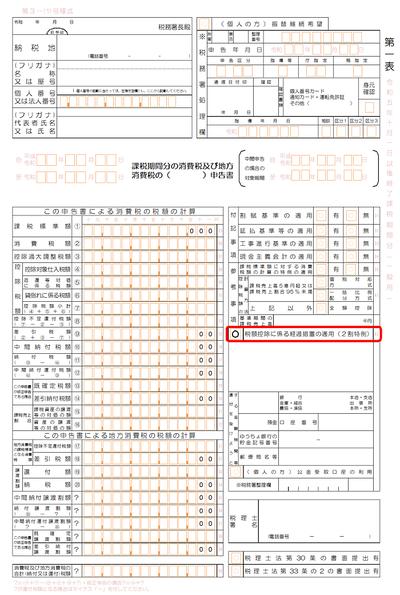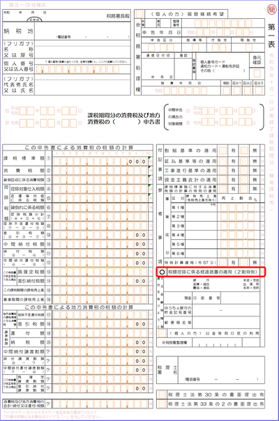 2割特例を適用しているか確認する方法は、下記のとおり確定申告書の赤枠で囲われた箇所で確認することができます。