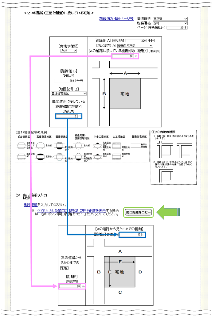 「間口距離をコピー」ボタンをクリックすることにより、その奥行距離に対応する間口距離が、奥行距離欄にコピーされます。
