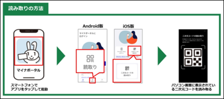 スマートフォンにインストールした「マイナポータルアプリ」でパソコン等の画面に表示されたQRコードを読み取り、認証を行います。